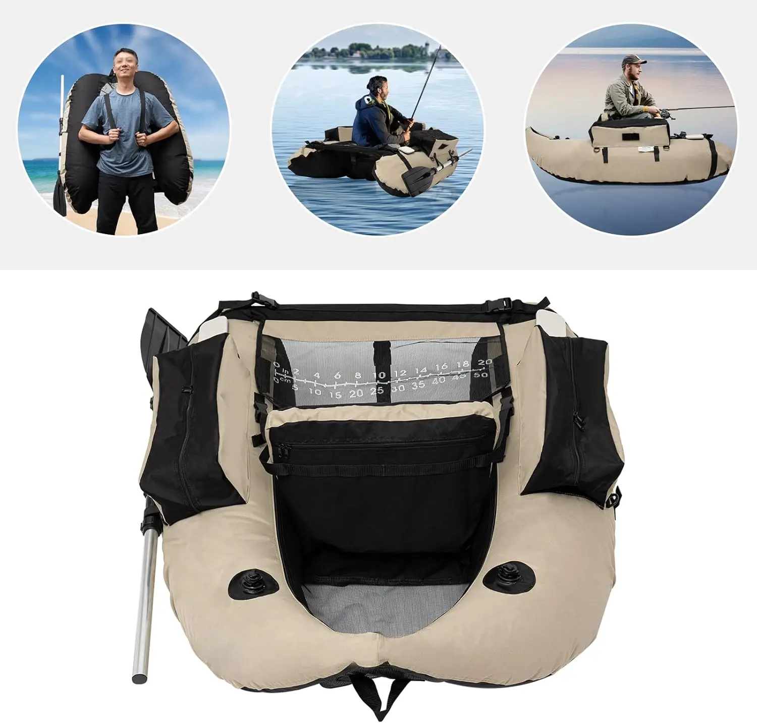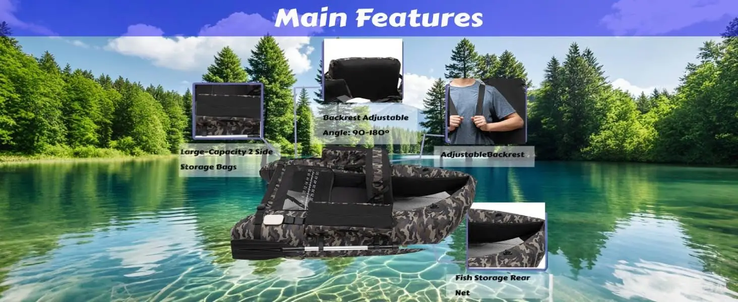 🛶 How to use it - 1. Inflate the boat using the included hand pump. 2. Adjust the backrest to your comfort level. 3. Secure your essentials in the storage pockets. 4. When ready, use paddles or fins to navigate and fish seamlessly. 5. After use, deflate and store easily in a cabin or trunk.
